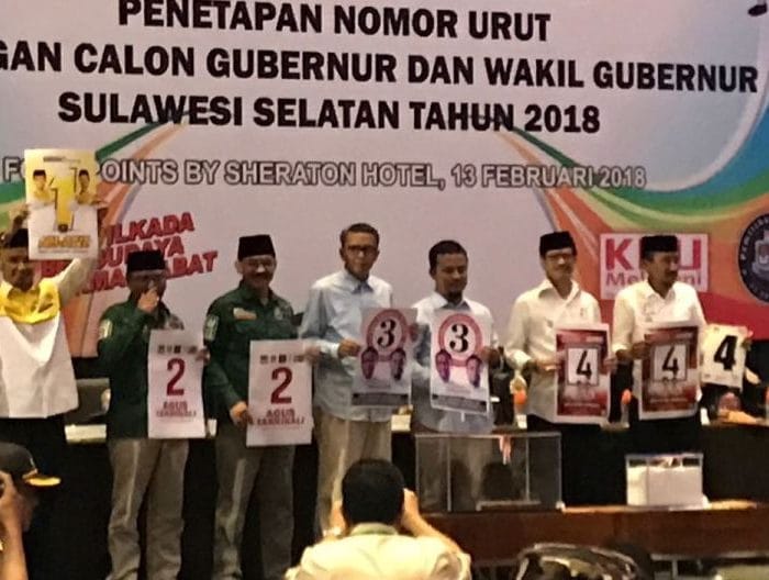 Berdasarkan hasil pencabutan nomor yang ditetapkan KPUD, Pasangan Nurdin Halid-Aziz Qahhar Mudzakkar (NH-Azis) mendapatkan nomor urut 1. Agus Arifin Nu’mang-Tanribali Lamo (NA-TBL) dengan nomor urut 2. Nurdin Abdullah-Andi Sudirman Sulaiman (NA-SS) memperoleh nomor urut 3 dan Ichsan Yasin Limpo- Andi Mudzakkar (IYL-Cakka) mendapatkan nomor 4.