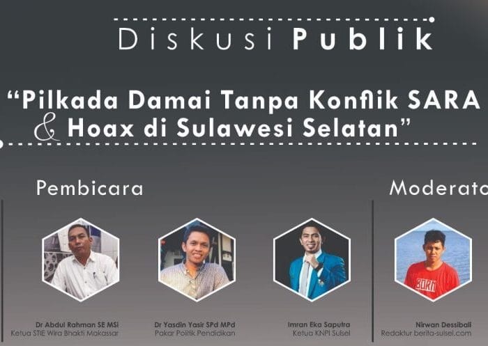 DIskusi Pilkada damai ini dilaksanakan di Warkop Press Corner, Jalan Pengayoman, Makassar dengan menghadirkan tiga pembicara. Yakni dosen Universitas Negeri Makassar, Dr Yasdin Yasir SPd MPd, Ketua STIE Wira Bhakti Makassar, Dr. Abdul Rahman SE MSi dan Ketua KNPI Sulawesi Selatan yang juga mantan aktivis HMI, Imran Eka Putra.