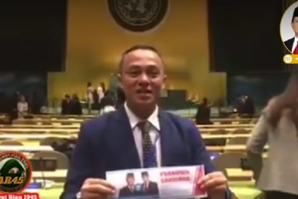 Dalam video yang tersebut, nampak pria itu memakai jas dan membawa kertas bergambar Prabowo Subianto dan Sandiaga Uno (Prabowo-Sandi). Dia berada di ruangan Majelis Umum PBB di New York, Amerika Serikat.