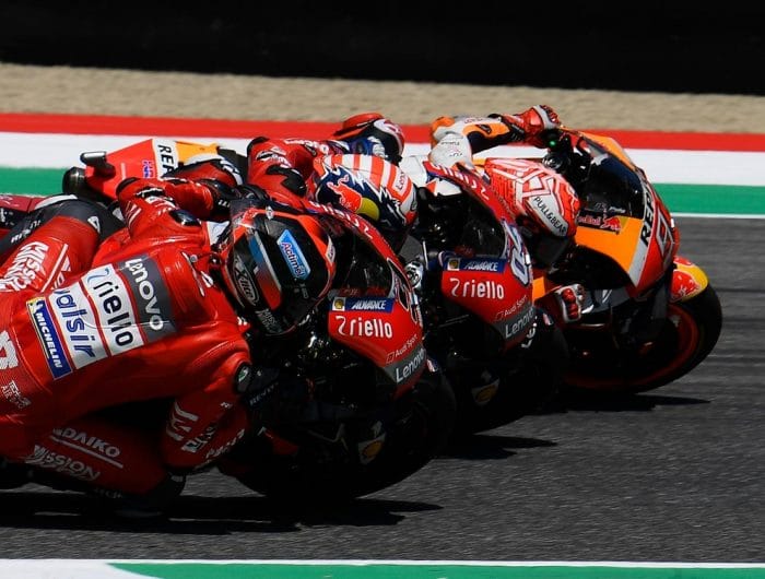 Petrucci baru saja meraih kemenangan pertama di MotoGP. Momen itu terjadi di MotoGP Italia dua pekan lalu. Dua pebalap Ducati, Petrucci dan Dovizioso, mengapit Marquez saat membalap di Mugello.