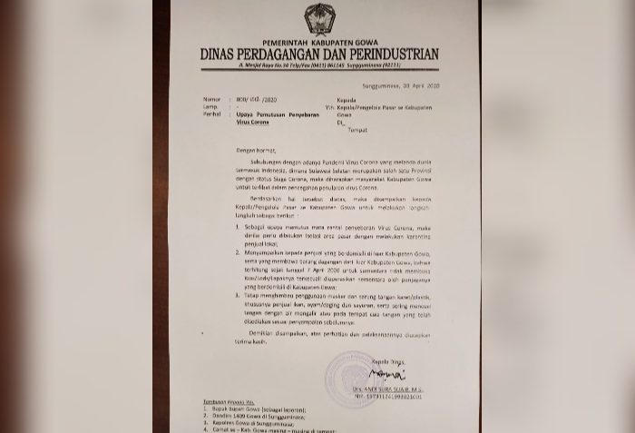 Pemkab Gowa melalui Dinas Perdagangan dan Perindustrian (Disperdastri) kembali mengeluarkan surat untuk seluruh pasar yang di Kabupaten Gowa agar terlibat dalam penanganan penularan Covid-19.