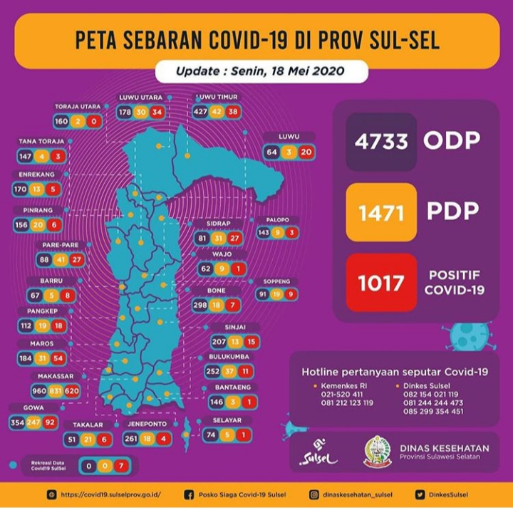 Sebelumnya, pada Minggu (17/5/2020) kemarin, total kasus positif di Sulsel sebanyak 951 kasus.