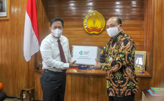 Pada kesempatan tersebut, Staf Ahli Kementerian Kesehatan dr. Robby menyerahkan bantuan APD dari Kemenkes dan Dinkes Provinsi Sulsel kepada Pemerintah Kabupaten Kepulauan Selayar yang diterima langsung oleh Pjs. Bupati Asriady Sulaiman.