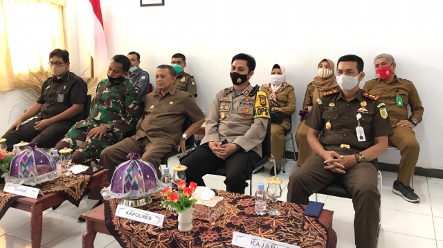 Hadir bersama Sekretaris Daerah, para Anggota Forum Koordinasi Pimpinan Daerah, Ketua KPU, Ketua Bawaslu, Kasat PolPP, Kepala BPBD, serta Badan Kesbangpol.