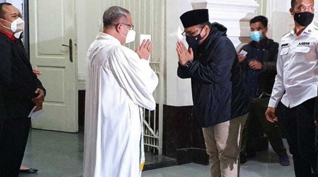 Selang beberapa menit, Gus Yaqut keluar dan menyapa awak media yang sudah menanti di depan gereja.