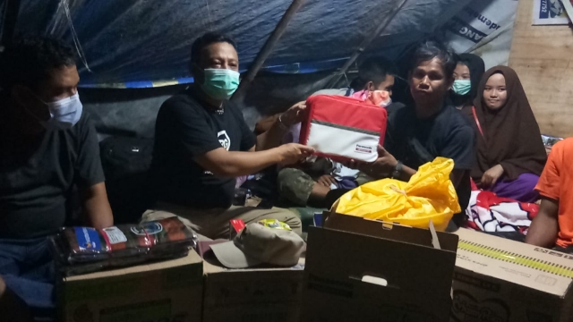 Adapun bantuan yang dibagikan di tempat tersebut yakn emergency kit yang di dalamnya berupa radio senter dan lampu.