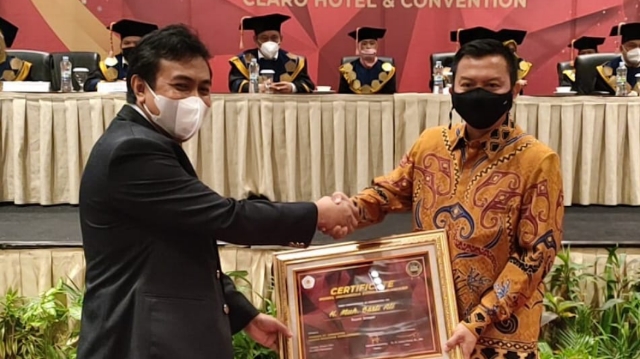 Penyerahan pelakat penghargaan diterima Bupati Basli Ali disela-sela pelaksanaan Wisuda Sarjana XVI dan Pasca Sarjana VIII STIE Nobel Indonesia di Claro Hotel dan Convention Makasaar, Kamis (8/4/2021).