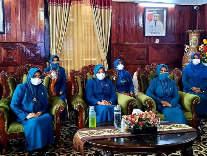 Tampak Istri orang nomor satu di Kabupaten Kepulauan Selayar ini Dwiyanti Musrifah beserta jajarannya memakai seragam nasional resmi PKK dengan menerapkan prokes mengenakan masker dan menjaga jarak mengikuti secara saksama pelantikan secara virtual.