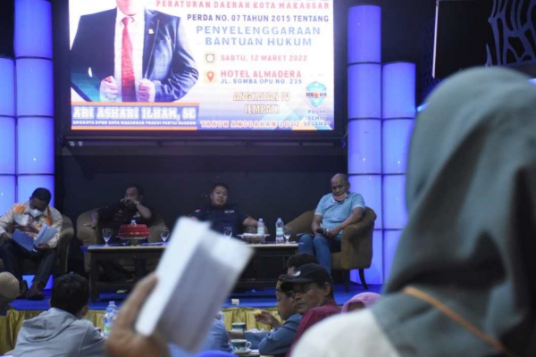 Makassar, PANRITA.News – Anggota DPRD Kota Makassar, Ari Ashari Ilham menggelar sosialisasi peraturan daerah (Perda) nomor 7 tahun 2015 tentang Penyelenggaraan Bantuan Hukum di Hotel Almadera, Jalan Somba Opu, Sabtu (12/3/2022).