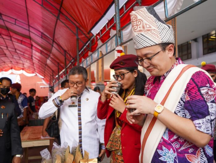 Di sela – sela Rakornas, Jerry Sambuaga dan Taufan Pawe mengunjungi stand kopi. Keduanya bersama Bupati Tana Toraja Theofilus Allorerung dan Bupati ToraJa Utara Yohanis Bassang kompak mencoba kopi khas Toraja.