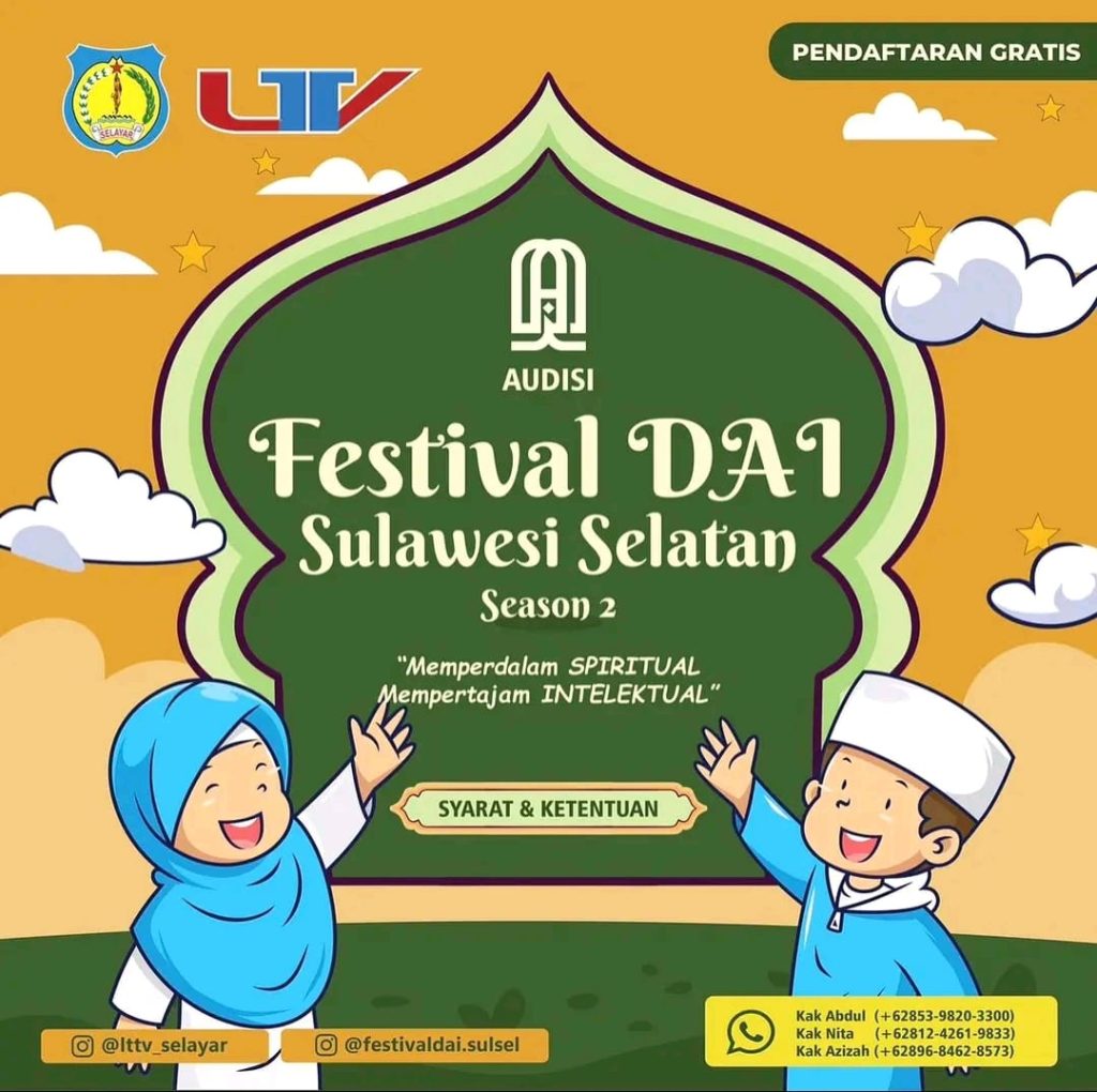 Selayar, PANRITA.News – Setelah Sukses mengelar Festival Da’i Sulawesi Selatan pada Tahun 2023 lalu, Lembang Tanadoang TV (LTTV) kerjasama dengan Pemkab Kepulauan Selayar kembali menggelar Audisi Festival Da’i Tingkat Sulawesi Selatan Season II 2024 dengan mengangkat tema “Memperdalam Spiritual, Mempertajam Intelektual”.